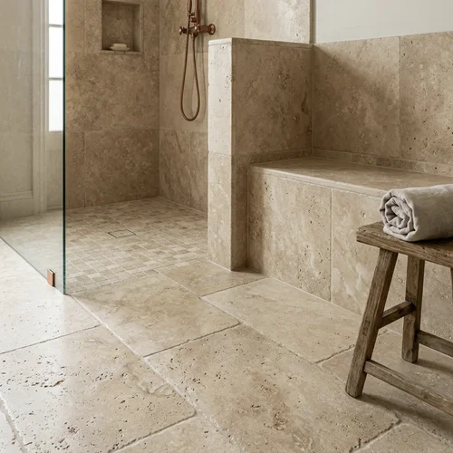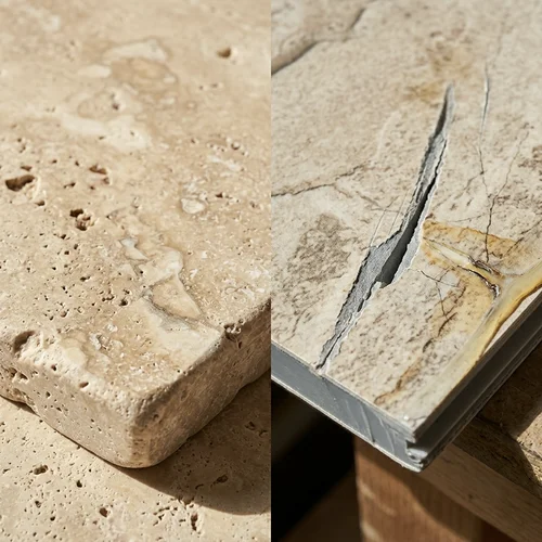 Badsanierung Risiken im Detail: Während echter Naturstein wie Travertin bei Kratzern reparierbar bleibt, führen Beschädigungen an künstlichen Verbundplatten oft zu dauerhaften optischen Mängeln und Schimmelrisiken.