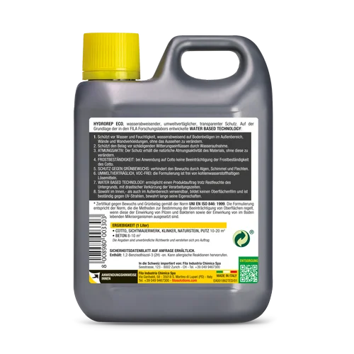 Genau hier kommt der FILA Hydrorep Eco ins Spiel. Er ist der absolute Spezialist für offenporige und stark strukturierte Oberflächen im Innen- und Außenbereich. Als umweltfreundlicher Steinbeschützer zieht er tief in das Material ein und macht es zuverlässig wasserabweisend – und das völlig unsichtbar. Die wunderschöne, matte Optik deines Steins bleibt zu 100% erhalten!