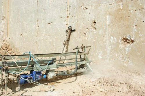 Bohrung zum einführen der SeilsägeEine SeilsägeTravertinblock welcher mit der Seilsäge vom Fels abgesägt wurde