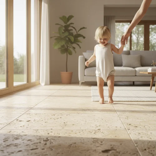 Sanft zu kleinen Füßen: Dank Fußbodenheizung wird Travertin zur behaglichen Wärmebatterie in Ihrem Zuhause.